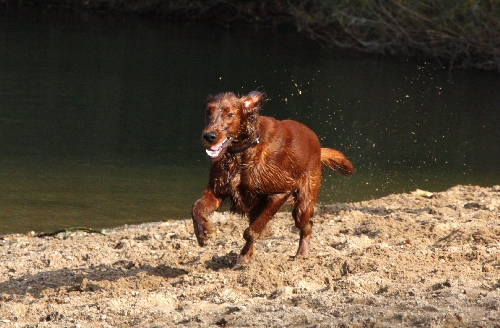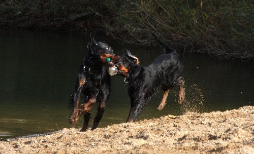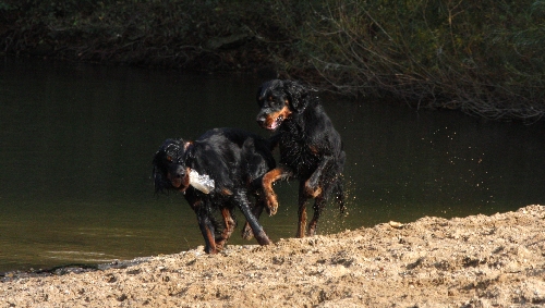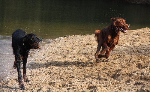 Don (10 Monate alt) hatte etwas am Ufer gefunden, leider Abfall. Er fand's aber super toll und rannte mit "seinem Schatz", einer leeren Plastikflasche, stolz hin und her, damit auch alle sehen konnten, was für ein tolles Ding er da hatte. Nicht nur Goofy (knapp 9 Monate alt) war offensichtlich sehr neidisch und nahm die Verfolgung auf. Auch Greenhorn Quincie (9 1/2 Monate alt) wurde zur Rakete ... sehr albern die drei Flöhe ;o)
