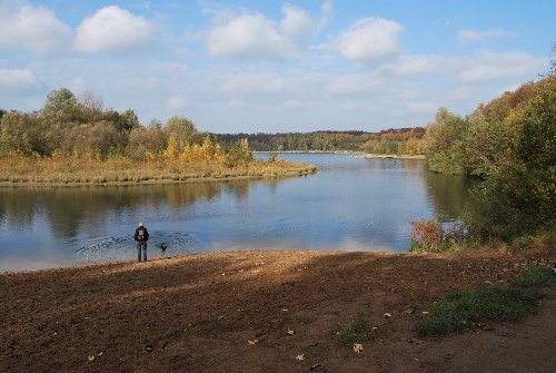 Langsam verstanden wir, warum Andreas hier gerne mit Gordon Setter Dusty spazieren geht. Das war wirklich eine schöne Spazierstrecke. Für den Weg über die Brücke und damit auch über die Autobahn A42 nahmen wir unsere Hunde natürlich an die Leine. Aber dann ging' zum Waldsee, wo die Vierbeiner im weichen Sand am Ufer toben und sich im See erfrischen konnten.