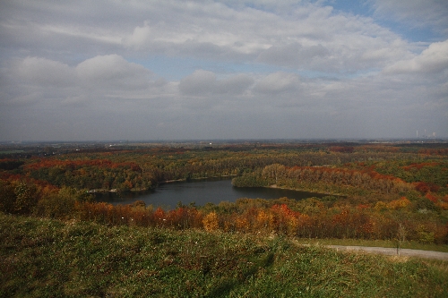 Oben angekommen wurden wir belohnt mit einem Blick auf den Waldsee, die Industrielandschaft am Niederrhein und das Mündungsgebiet der alten und neuen Emscher in den Rhein. Die 35 Leuchtmasten, die man hier sieht, tauchen abends eine Fläche von ca. 8.000 Quadratmetern der Halde in ein rotes Licht.