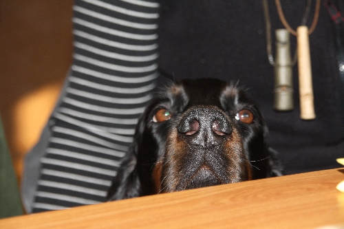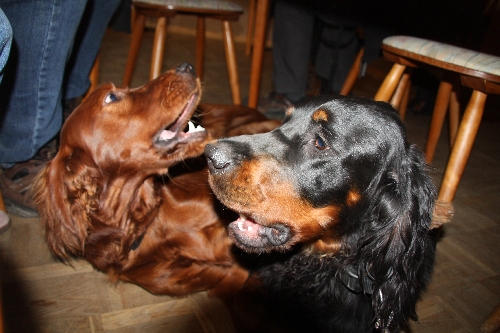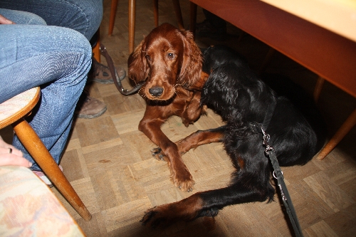 Nach kurzer Pause waren unsere Hunde schnell wieder fit genug zum Schmusen (Alice), kontrollieren, was wir Menschen da essen (Connor) oder unter'm Tisch spielen (Quincie + Goofy) :o)