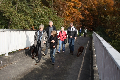 Langsam verstanden wir, warum Andreas hier gerne mit Gordon Setter Dusty spazieren geht. Das war wirklich eine schöne Spazierstrecke. Für den Weg über die Brücke und damit auch über die Autobahn A42 nahmen wir unsere Hunde natürlich an die Leine. Aber dann ging' zum Waldsee, wo die Vierbeiner im weichen Sand am Ufer toben und sich im See erfrischen konnten.