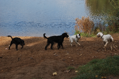 Don (10 Monate alt) hatte etwas am Ufer gefunden, leider Abfall. Er fand's aber super toll und rannte mit "seinem Schatz", einer leeren Plastikflasche, stolz hin und her, damit auch alle sehen konnten, was für ein tolles Ding er da hatte. Nicht nur Goofy (knapp 9 Monate alt) war offensichtlich sehr neidisch und nahm die Verfolgung auf. Auch Greenhorn Quincie (9 1/2 Monate alt) wurde zur Rakete ... sehr albern die drei Flöhe ;o)