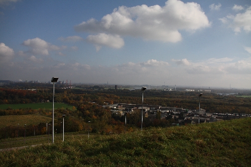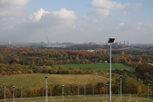 Oben angekommen wurden wir belohnt mit einem Blick auf den Waldsee, die Industrielandschaft am Niederrhein und das Mündungsgebiet der alten und neuen Emscher in den Rhein. Die 35 Leuchtmasten, die man hier sieht, tauchen abends eine Fläche von ca. 8.000 Quadratmetern der Halde in ein rotes Licht.