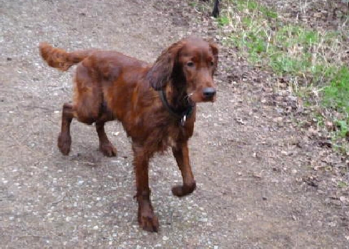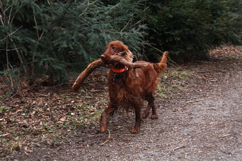 War der Silvesterspaziergang leider komplett "Irish-Setter-los" gewesen, bekamen wir beim "Gnomengang" erfreulicherweise mehrfache feuerrote Verstärkung. Neben Rocca (von Sandra und Uli) und Quincie (von Annett und Axel) schlossen sich uns zum ersten Mal Miriam und Christopher mit ihrem 8-Monate-alten Irish Setter Rüden Cooper an. Der Jungspunt war begeistert von so vielen Rassekollegen, mit denen er herum turnen konnte.