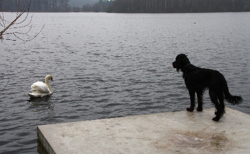So ein Schwan gehört zwar zur Familie der Entenvögel, ist aber doch um einiges größer. Unsere Hunde fanden den Schwan, der uns bei unserem Spaziergang auf dem Wasser parallel zum Weg ständig folgte, super spannend. Sie dachten scheinbar "Pfff ... Ente ist Ente!" Aber so ein Absprung ins Wasser ... von so einem Plateau ... bei dem Wetter ... zu so einem großen Vogel ... ohne die Gewissheit, dass man Rückendeckung von den Kollegen bekommt ... da muss man doch mal länger überlegen. Nicht wahr, Theo, Caruso, Faro, Hanni ... ? :o)